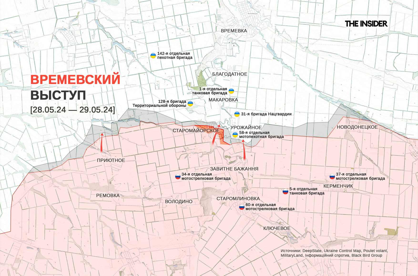 - Российские войска продвигаются на рубеже Старомайорское — Урожайное, но с темпом несколько сотен метров в день