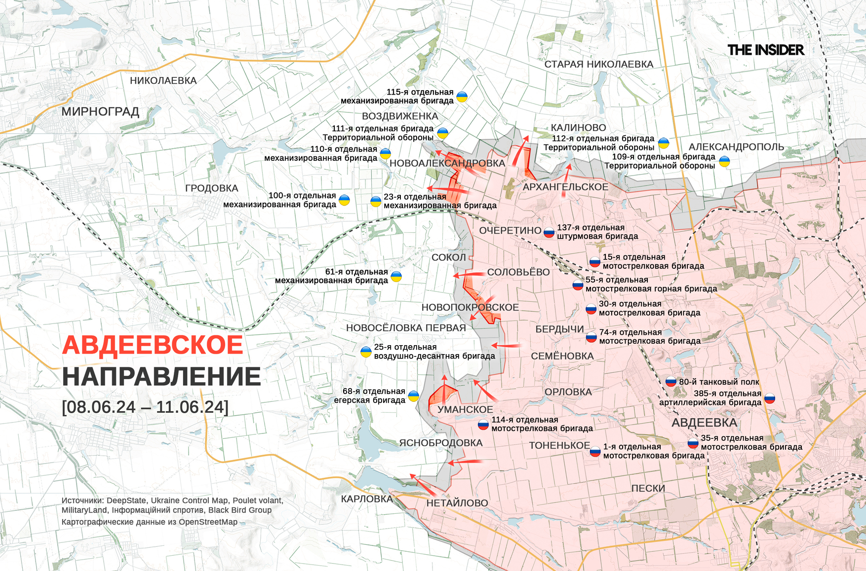 «Военкор» Юрий Котенок пишет о захвате ВС РФ поселка Новоалександровка к северо-западу от Очеретина, а DeepState сообщает о продвижении россиян южнее — рядом с Новопокровским.