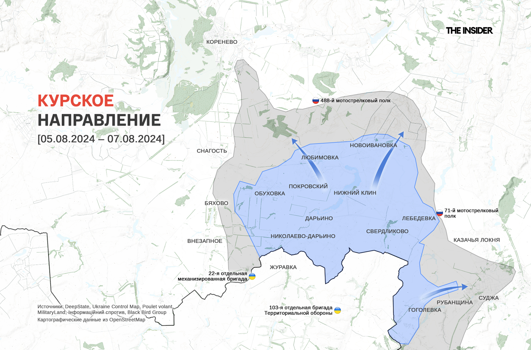 По состоянию на утро 7 августа, согласно оценкам пророссийских источников, ВСУ заняли в регионе 11 населенных пунктов, создав вклинение глубиной до 15 км и шириной 10–11 км. К вечеру появились сообщения о боях в райцентрах Коренево и Суджа и захвате украинскими военными газораспределительной станции «Суджа» — с 2022 года только через нее идет экспорт газа из России в Европу по наземным маршрутам.
