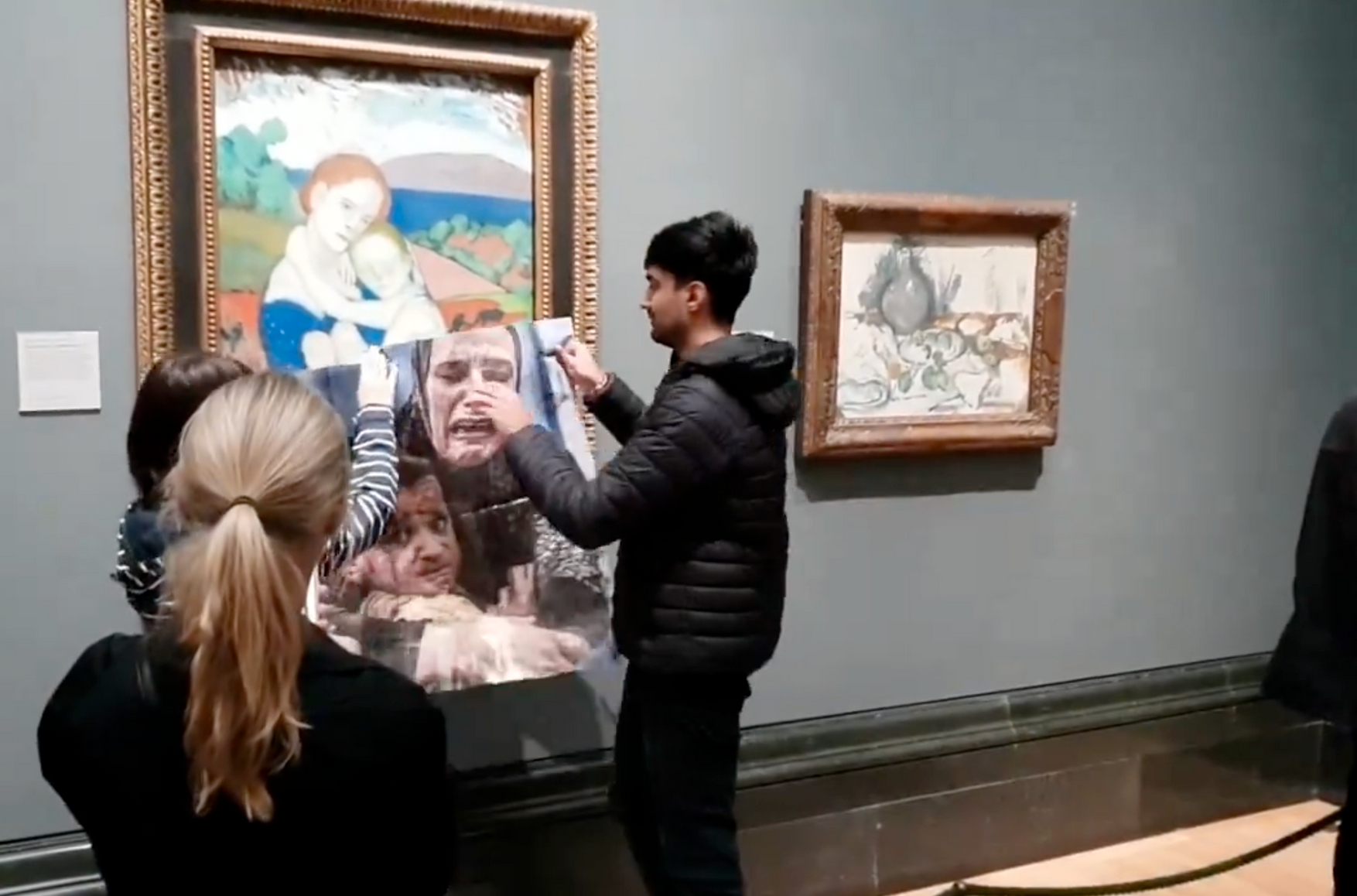 В самой галерее заявили, что задержаны двое активистов: «Один из них был задержан после того, как попытался прикрепить к произведению искусства лист бумаги. На пол пролилось немного краски. Прибывшая полиция арестовала двух человек. В настоящее время комната закрыта. Картины не пострадали».