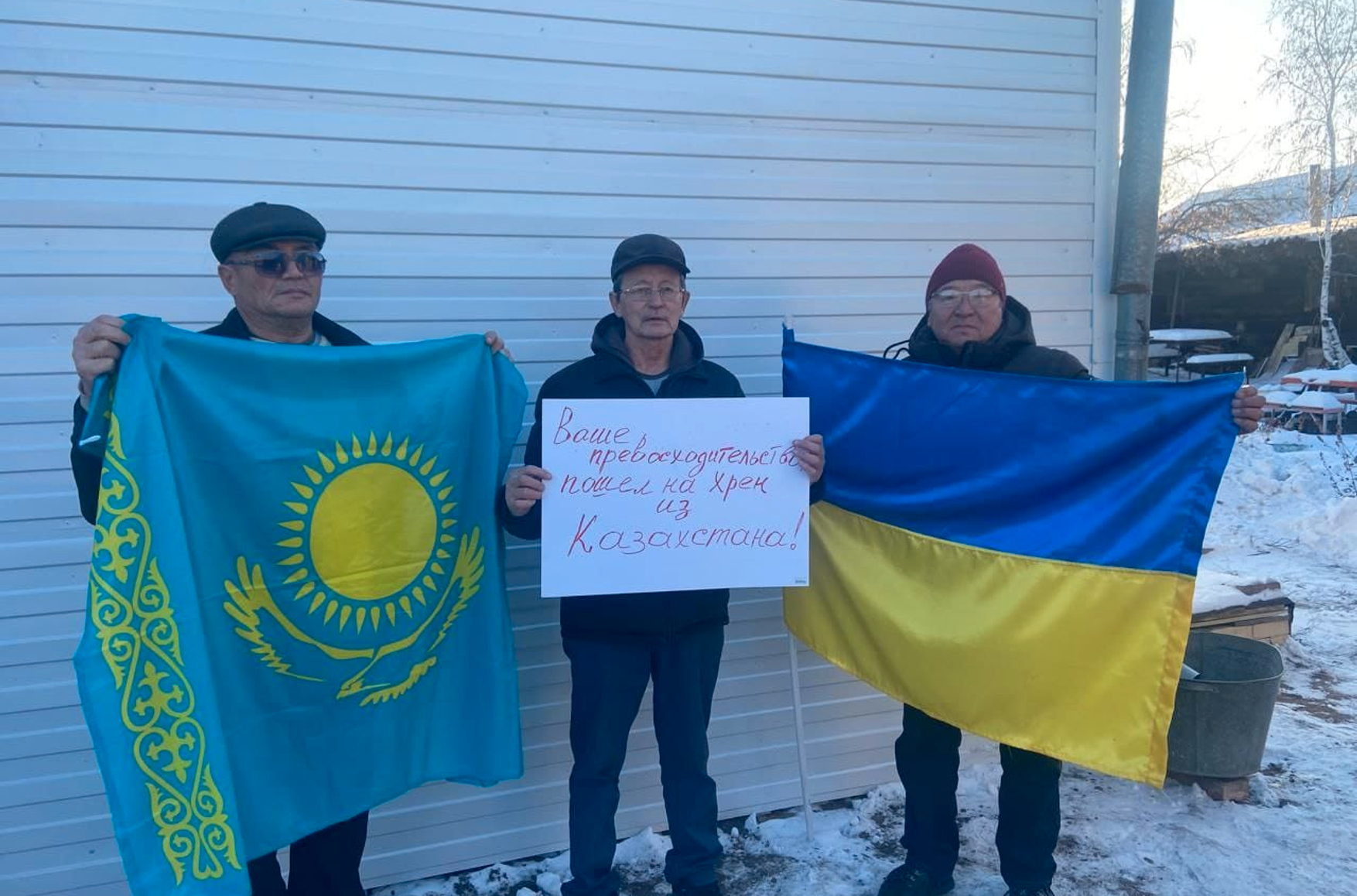 Как рассказывал Жанузаков «Азаттыку», активисты «лишь стояли возле дома и держали флаги Казахстана и Украины, ничего не говорили». По его словам, в полиции их продержали с девяти вечера до трех ночи. На опубликованной в интернете фотографии Балташев и Негметов стоят с флагами, а Жанузаков держит лист бумаги с надписью «Ваше превосходительство, пошел на хрен из Казахстана!».