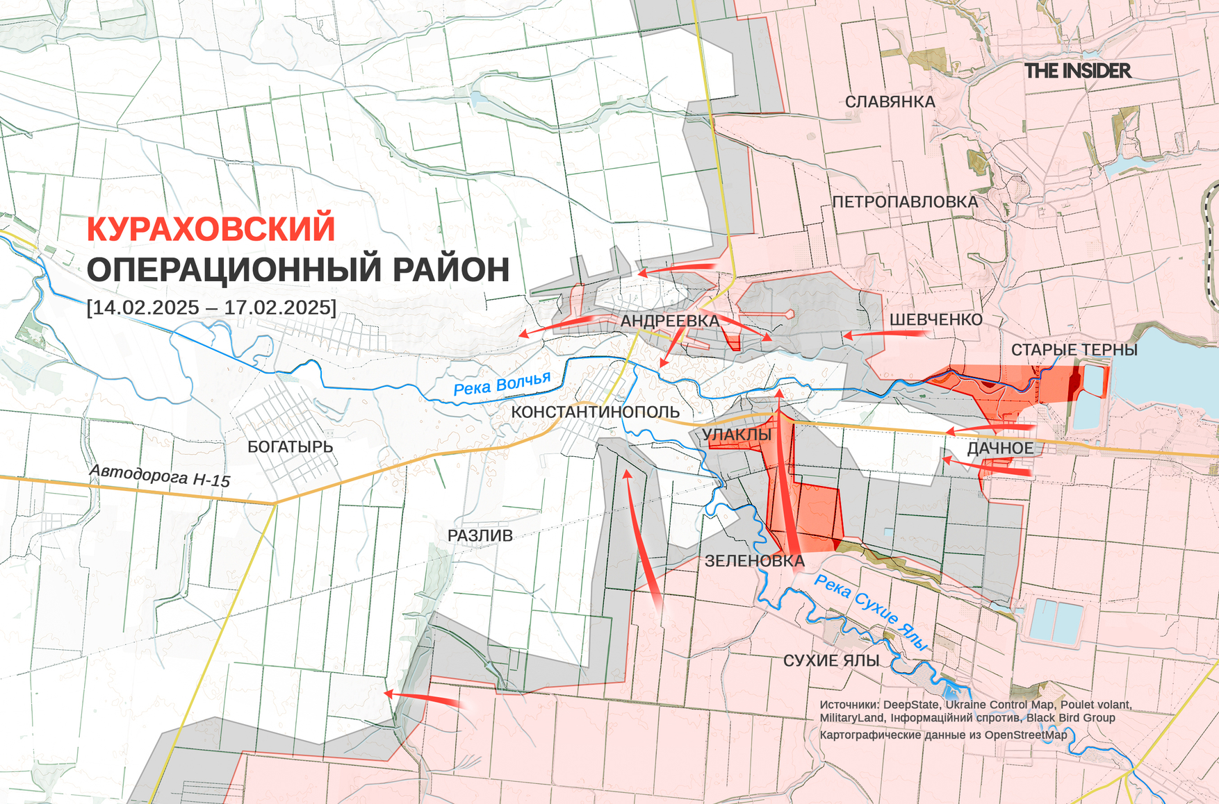DeepState сообщает (1, 2, 3) о продвижении ВС РФ около Зеленовки, Дачного, в Андреевке и на выходе к Улаклы. Аналитики проекта пишут о массированных атаках на Константинополь и Улаклы с применением бронетехники. По их данным, штурмы начались утром 16 февраля, в результате российская пехота смогла рассредоточиться на южных окраинах Константинополя, а после ВСУ провели там «стабилизационные действия». В DeepState выражают уверенность, что ВС РФ «пока что» не дадут закрепиться в этом селе.