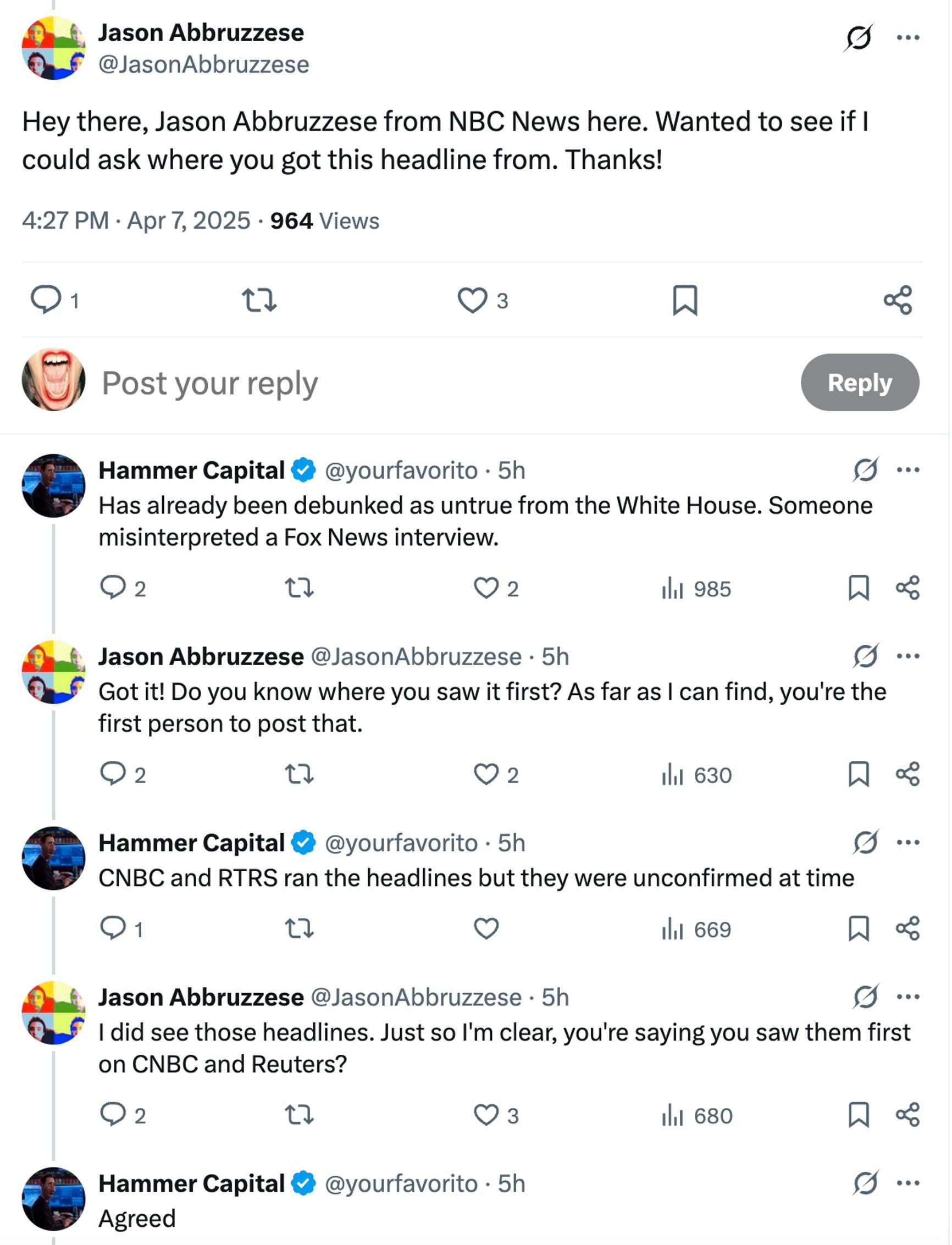 Репортер CNBC Джейсон Абрузессе спрашивает у анонимного аккаунта Hammer Capital, откуда тот взял заголовок о 90-дневной паузе. Тот отвечает, что видел их на CNBC и Reuters.