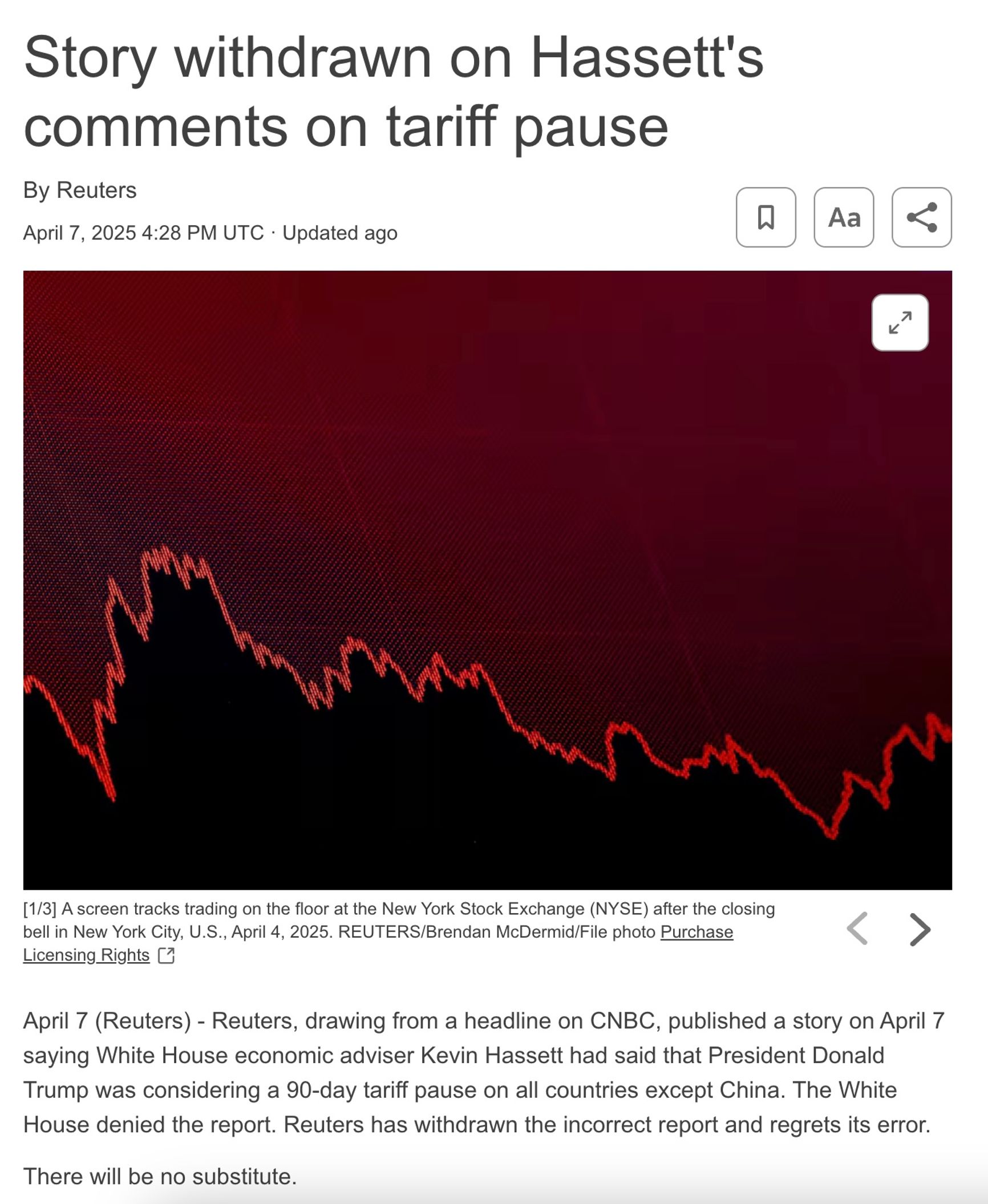 На сайте Reuters выходит короткая новостная статья с заголовком «Уолл-стрит меняет курс после комментариев Хассета о тарифной паузе». Журналист Reuters в Бангалоре отмечает, что Dow Jones начал резко расти и повторяет якобы цитату Хассета о том, что Трамп рассматривает 90-дневную паузу, ссылаясь на некое «интервью».