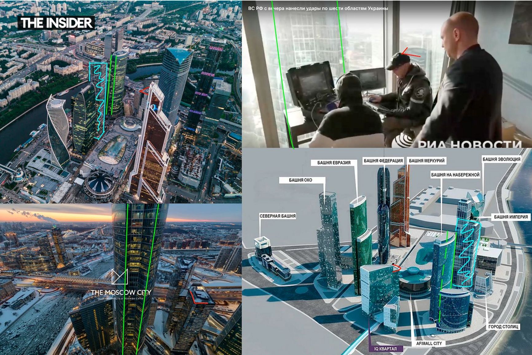 Наводчики находились в одном из помещений башни «Город столиц», определил The Insider. Справа хорошо определяется угол черной крыши «IQ-квартала», окна выходят прямо на торец «Башни на набережной», ее видно в левой части видео. Основную часть площадей в «Городе столиц» занимают жилые апартаменты и офисы, говорится на сайте жилого комплекса.