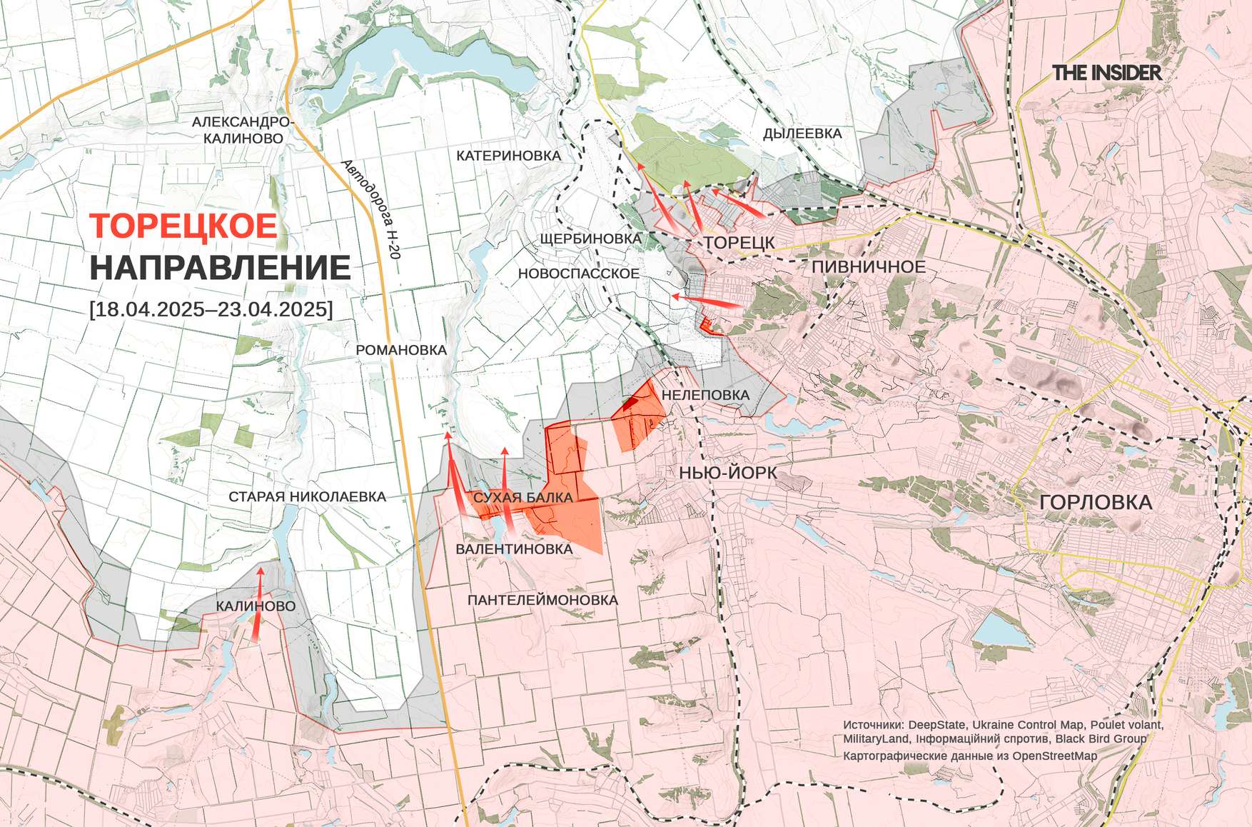 DeepState отмечает продвижение российских войск в Торецке и в Нелеповке. Аналитики проекта пишут, что ВС РФ нашли «слабое место» в украинской обороне и сравнительно быстро прорвали рубеж Валентиновка — Пантелеймоновка и вышли к Сухой Балке юго-западнее Торецка, получив возможность обойти линию Леонидовка — Щербиновка, которую до сих пор неудачно штурмовали.