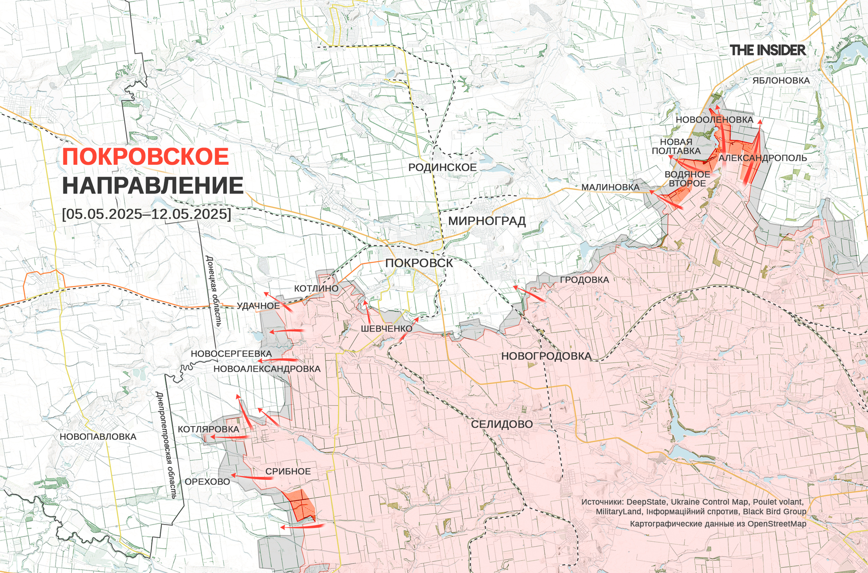 Согласно сводкам DeepState (1, 2, 3), в период с 7 по 12 мая ВС РФ продвинулись в Новооленовке, Александрополе и Новой Полтавке, а также в районе Водяного Второго на восточном фланге направления и в районе Срибного на западном фланге.