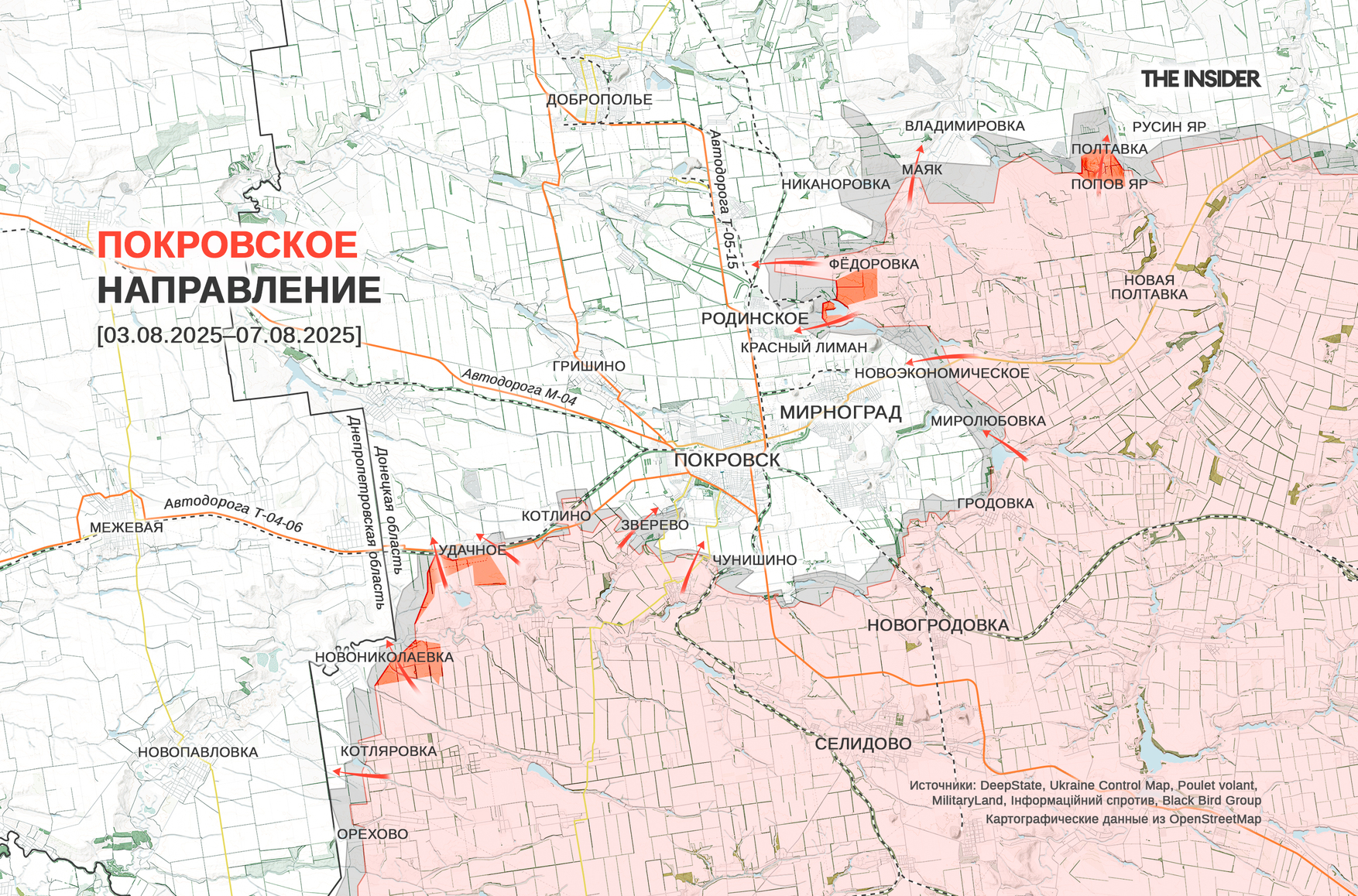 Украинский военный обозреватель Константин Машовец считает (1, 2), что российское командование развертывает ударные группы для прорыва непосредственно в город Покровск (до 2016 года — Красноармейск). Параллельно с этим российские силы атакуют Маяк, Владимировку и Русин Яр на восточном фланге направления, однако закрепиться в этих населенных пунктах, по сведениям Машовца, им пока не удалось, а СОУ успешно контратаковали в районе Маяка. Также ВС РФ сумели дойти до города Родинское на трассе Покровск — Доброполье, но не закрепиться в нем. По мнению Машовца, российское командование стремится любой ценой перерезать трассу Покровск — Доброполье и взять под огневой контроль соседний логистический маршрут через Гришино, а в боях за Родинское решается судьба всей агломерации Покровска и Мирнограда (до 2016 года — Димитров).