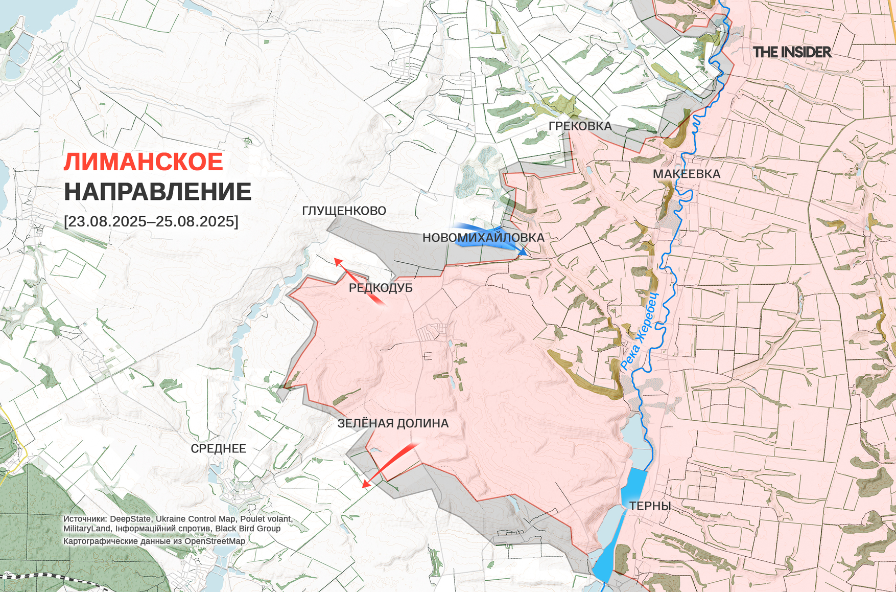 Константин Машовец подтверждает закрепление ВС РФ в Заречном и предполагает, что Торское полностью занято россиянами. Он также считает, что в ближайшее время россияне полностью займут Серебрянское лесничество до реки Жеребец. На плацдарме на правобережье Жеребца, по сведениям Машовца, ВС РФ атакуют по направлениям на Карповку и Шандриголово с некоторыми успехами. СОУ, как пишет Машовец, ликвидировали вклинение на Глушенково и продолжают удерживать Карповку и Редкодуб. Информация о ситуации в Грековке всё еще нуждается в подтверждении, полагает аналитик.