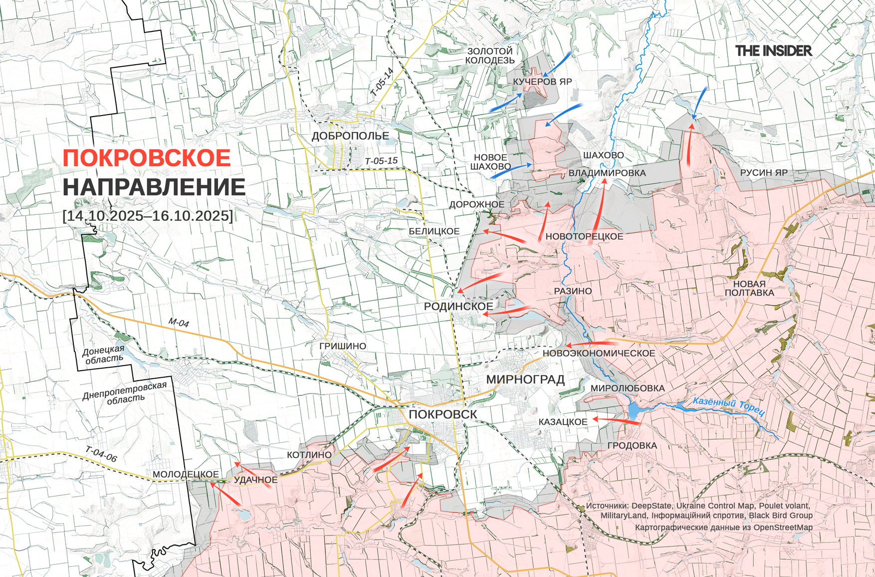 В DeepState сообщили об успешных украинских контратаках в районе Нового Шахова (до 2016 года — Розы Люксембург) и Кучерова Яра на Добропольском выступе. Исследователь под ником Playfra подтверждает эту информацию и представляет свою версию ЛБС на этом участке. Как он поясняет в комментариях, российские военные выживают в «котлах» благодаря пехоте, которая изредка «просачивается» через украинское окружение, и тяжелым дронам, доставляющим припасы по воздуху.