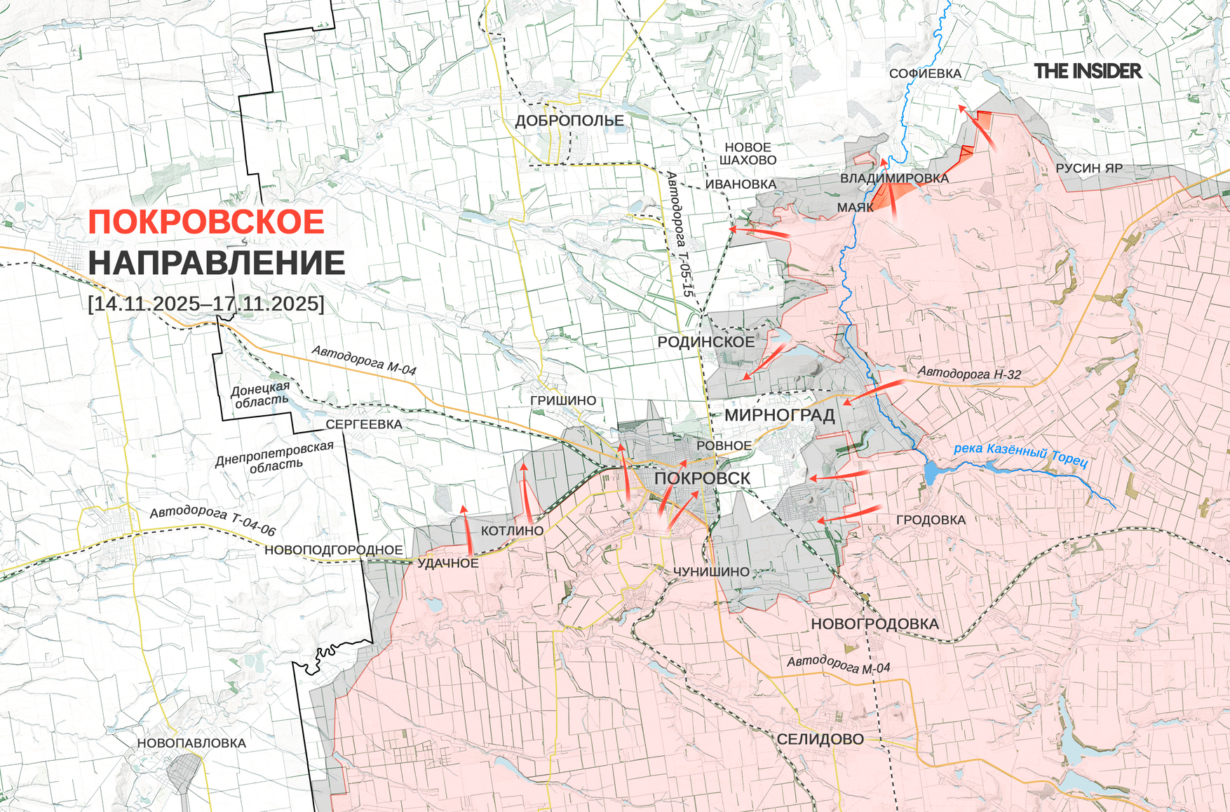 Украинский военный обозреватель Константин Машовец рассказывает (1, 2, 3), что в последнюю неделю ВС РФ осуществляли пополнение, снабжение и маневры под прикрытием тумана, а также расчищали и разминировали прифронтовые дороги для переброски подкреплений и техники к Покровску (до 2016 года — Красноармейск) и Мирнограду (до 2016 года — Димитров). В результате российских атак город Родинское на трассе Покровск — Доброполье вновь оказался в «серой зоне», а передовые российские группы дошли до северных окраин Мирнограда. Кроме того, в районе Добропольского выступа ряд российских групп смог «просочиться» в Ивановку и Новое Шахово (до 2016 года — Розы Люксембург). Российские военные, по сведениям Машовца, продолжают накапливаться в Покровске, а также продвинулись в районе Удачного на юго-западном охвате покровско-мирноградской агломерации. В то же время атаки в районе Котлина (до 2016 года — Димитрово) и Гришина к северо-западу от Покровска успеха не имели. Как рассказывает обозреватель, если в южной части Покровска российские силы оборудуют позиции БПЛА и минометов, то в северной части российские пехотные группы ведут бои в окружении, в отрыве от основных сил, причем группы СОУ в южной части города находятся в такой же ситуации.