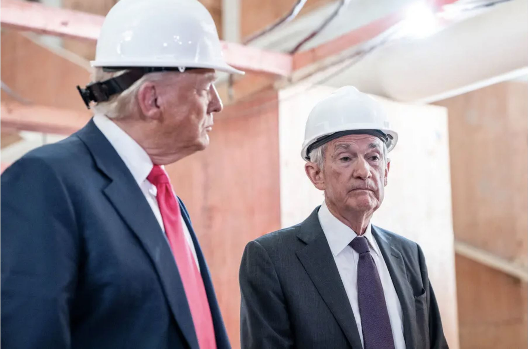 Президент США Дональд Трамп и председатель Федеральной резервной системы Джером Пауэлл осматривают место реконструкции в штаб-квартире Центрального банка в Вашингтоне в июле / The New York Times