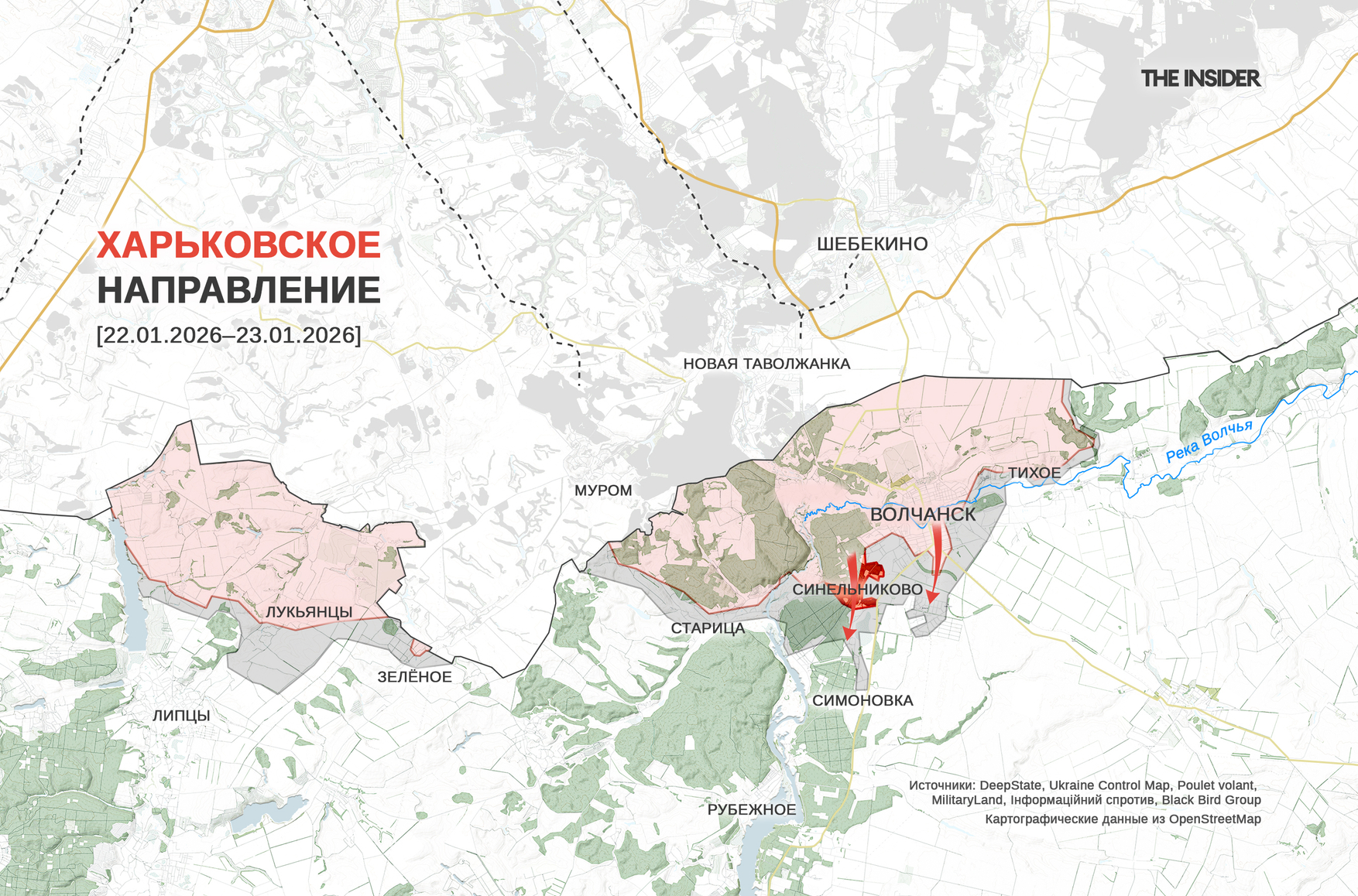 В DeepState отметили продвижение российских войск возле села Синельниково к югу от Волчанска. Минобороны РФ, в свою очередь, заявило о захвате села Симоновка (до 2016 года — Красноармейское Первое), которое расположено еще южнее. На карте DeepState «серая зона» дошла до северной окраины последнего.