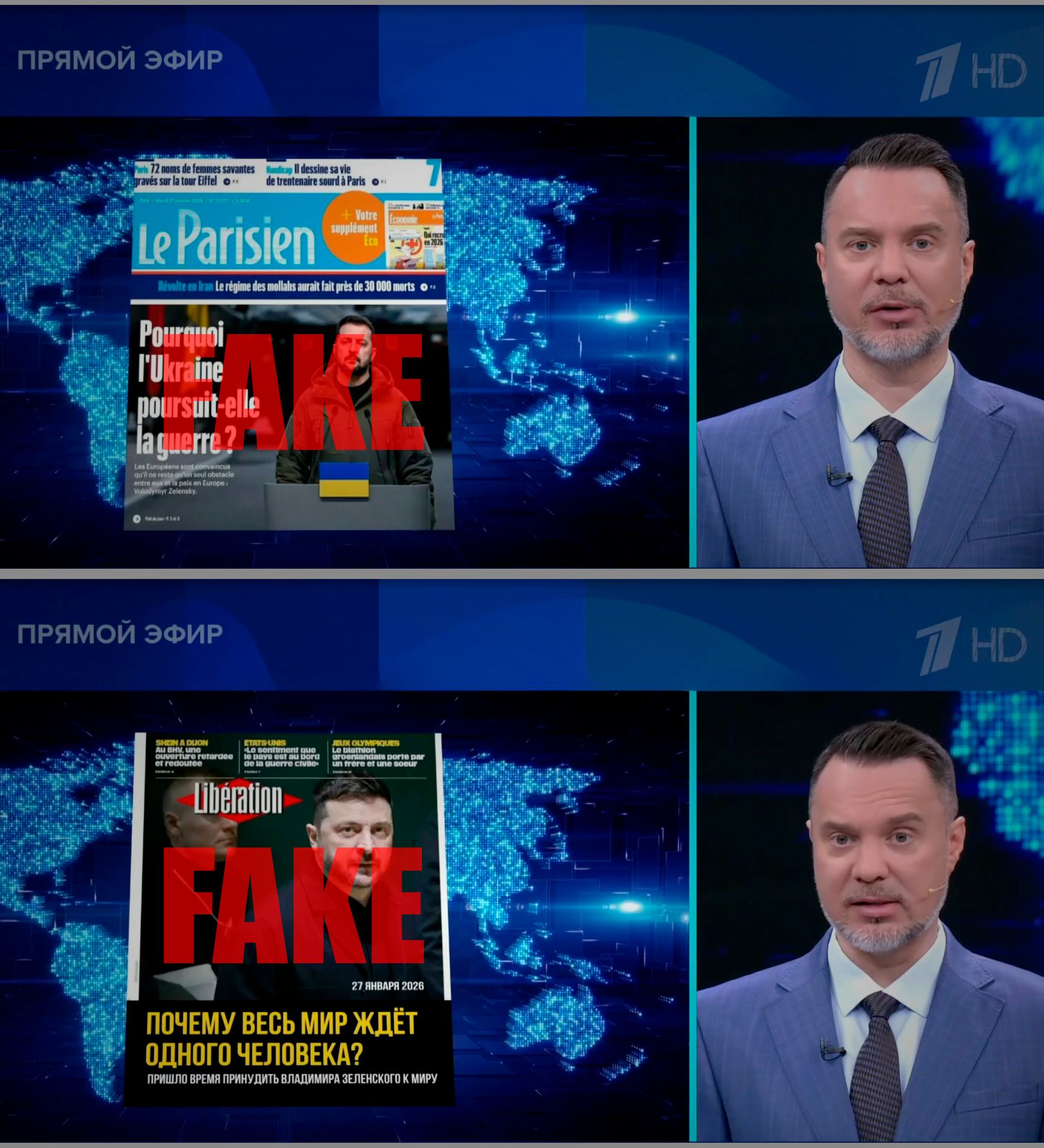 В эфире программы «Время покажет» на Первом канале рассказали о якобы критике Владимира Зеленского со стороны французской прессы и продемонстрировали обложки изданий Libération и Le Parisien. Однако, как выяснилось, показанные в студии первые полосы были поддельными.