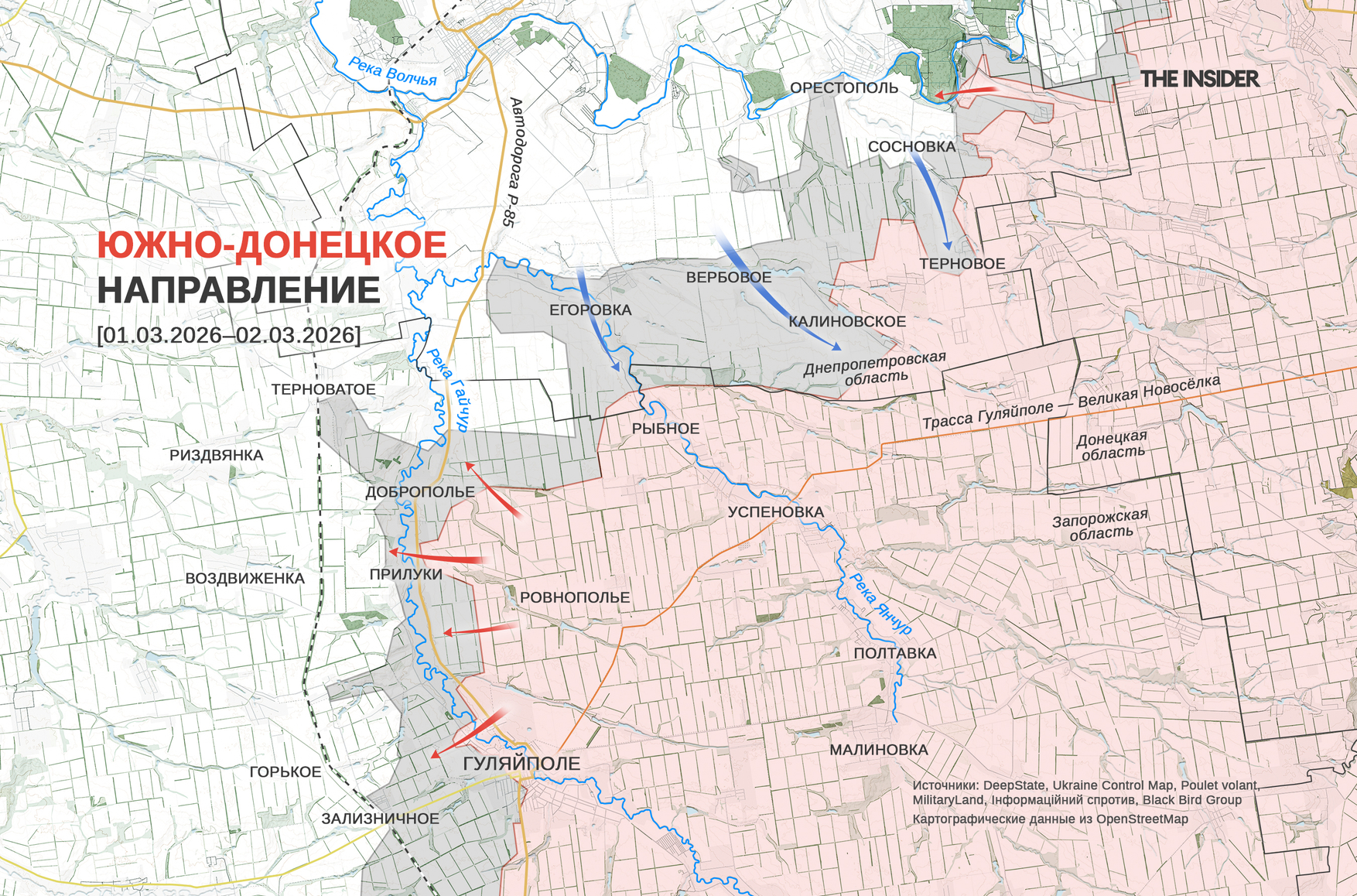 Константин Машовец считает, что «серая зона», образовавшаяся в результате украинских контратак, на самом деле больше, чем показано на карте DeepState, поскольку СОУ осталось всего 2 км до трассы Гуляйполе — Великая Новосёлка. В ДШВ сообщили о прорыве российской обороны и «тактическом продвижении» на этом участке. «Военкор» Юрий Котенок утверждает, что ВС РФ успешно удерживают оборону, однако признает, что обстановка там остается напряженной. OSINT-исследователь под ником Clément Molin, в свою очередь, считает, что украинские военные продвинулись не только в «серой зоне», но и на территории, подконтрольной ВС РФ с октября 2025 года. В то же время, по его сведениям, российские штурмовики по-прежнему наступают к западу от Гуляйполя и всё чаще «просачиваются» в Зализничное.