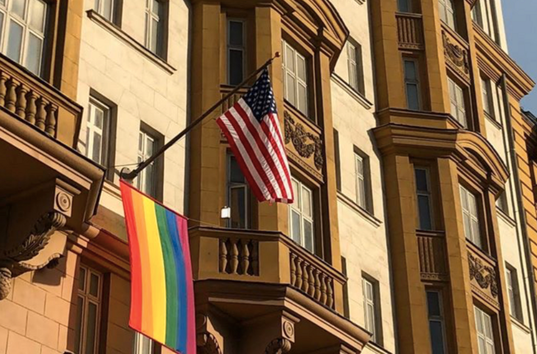 Посольство США в Москве вывесило на фасаде своего здания со стороны Садового кольца флаг ЛГБТ в честь Дня радужного флага. Об этом представительство сообщило на своей странице в Facebook.