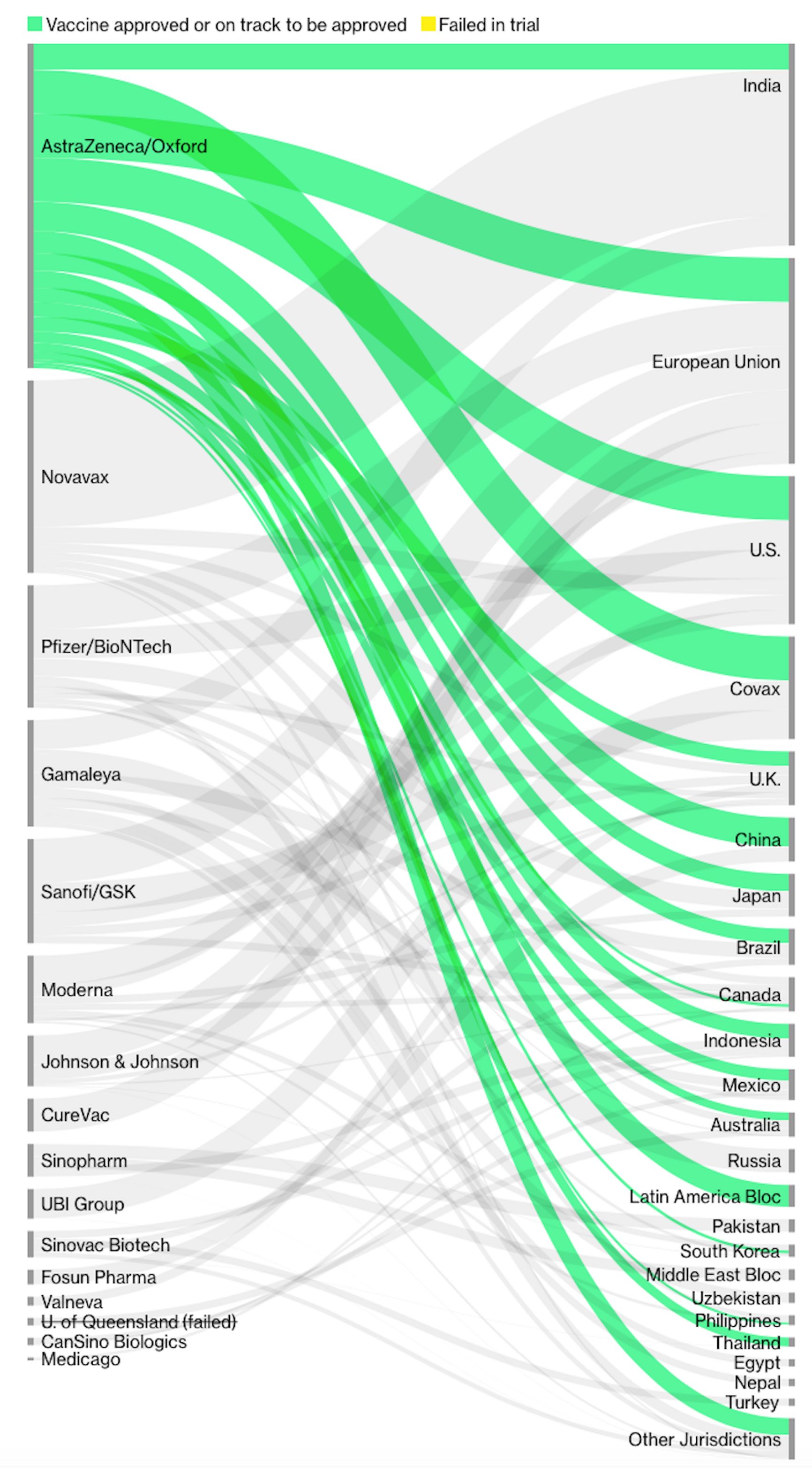 С разворачиванием вакцин в мире дела обстоят не очень хорошо. Как и ожидалось, проблемы масштабирования и логистики приводят к пробуксовкам у всех производителей. У Bloomberg есть прекрасная инфографика, показывающая, сколько различные компании обязались поставить вакцин разным странам.