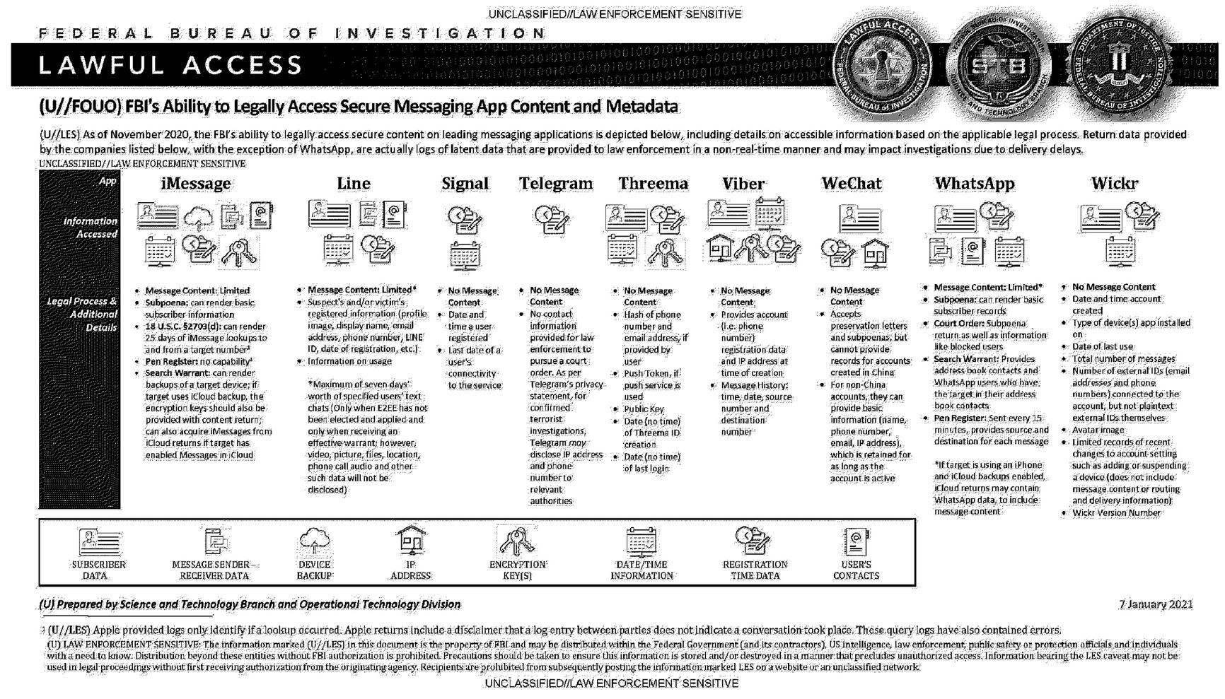 Американские силовики признали, что Telegram может выдавать только данные о номере телефона и ip-адресе пользователя, но никогда не передает содержимое сообщений и даже социальный граф пользователя (данные о том, с кем он общается). Согласно той же справке ФБР, получить намного более широкий доступ к сообщениям из WhatsApp при этом вполне возможно — если бэкап происходит через iPhone или iCloud. То есть в этом случае передача сообщений силовикам будет происходить от Apple. Сама компания Apple также согласна выдавать властям сообщения из собственного мессенджера — как попавшие в бэкап, так и свежие. Впрочем, и WhatsApp бывал замечен в передаче переписок властям — именно так арестовали и приговорили к заключению высокопоставленную сотрудницу Минфина США Натали Эдвардс, передававшую журналистам секретные документы именно в этом мессенджере. Ее вина была доказана с использованием данных, полученных от WhatsApp, несмотря на заявления владельца компании Марка Цукерберга о том, как он радеет о приватности пользователей.