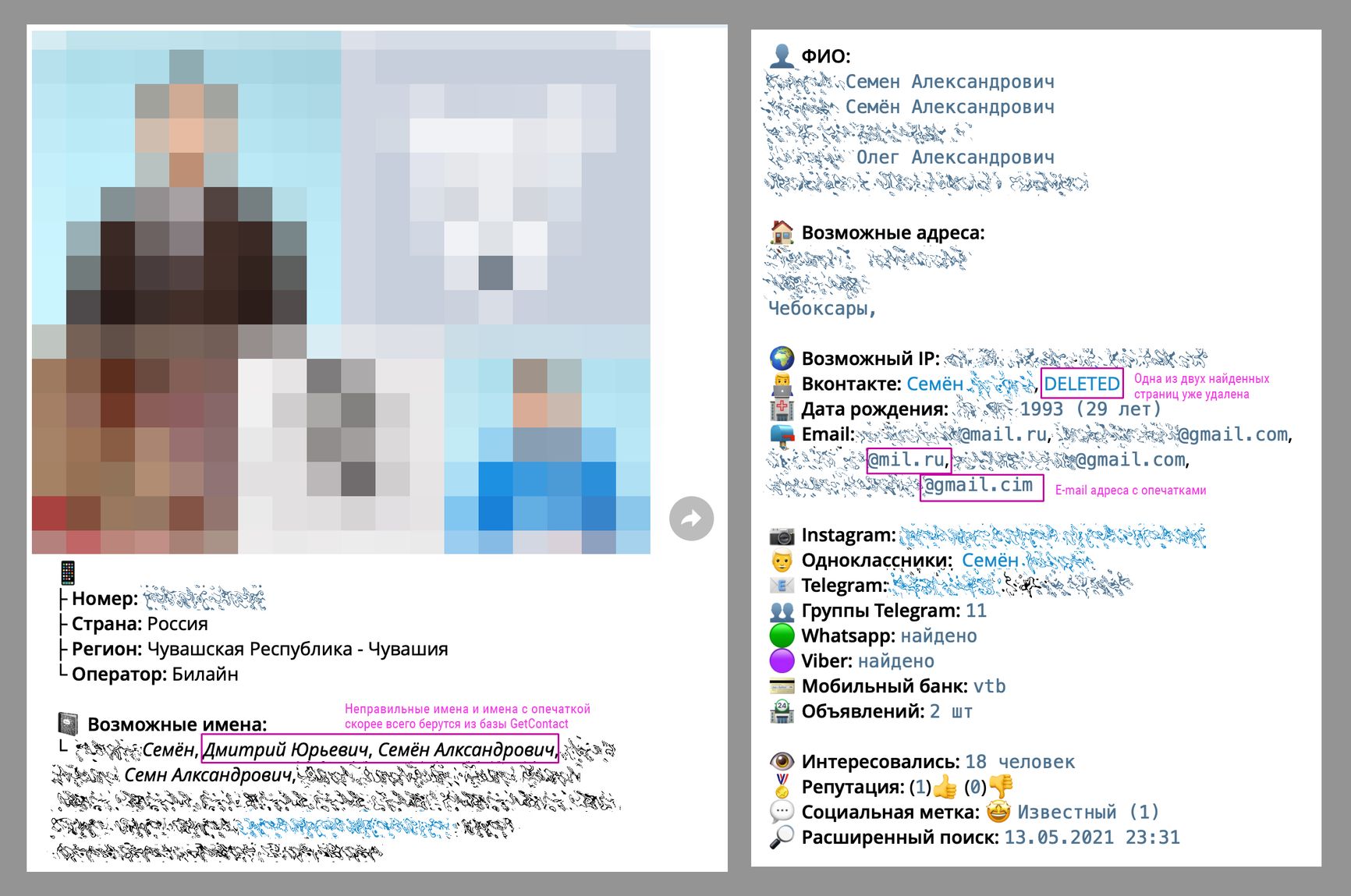 Чтобы понять, какие данные могут стать доступны о пользователе через приложения с утечками, The Insider попросил телефон волонтера и «пробил» его в одном из популярных ботов. Волонтер сейчас не живет в России, однако приложение точно показало его регион, где он жил в России и занимался активизмом. Также за несколько секунд мы нашли фотографии человека в разное время, полное имя и отчество, два ip-адреса — в Казани и в Москве, две страницы «ВКонтакте» и по одной в Instagram, «Одноклассниках» и Telegram, три e-mail адреса, полную дату рождения, 11 групп и чатов в Telegram. Мы узнали, что человек использует мобильный банк ВТБ и давал как минимум два объявления на «Авито». Достоверность полученных данных волонтер подтвердил.