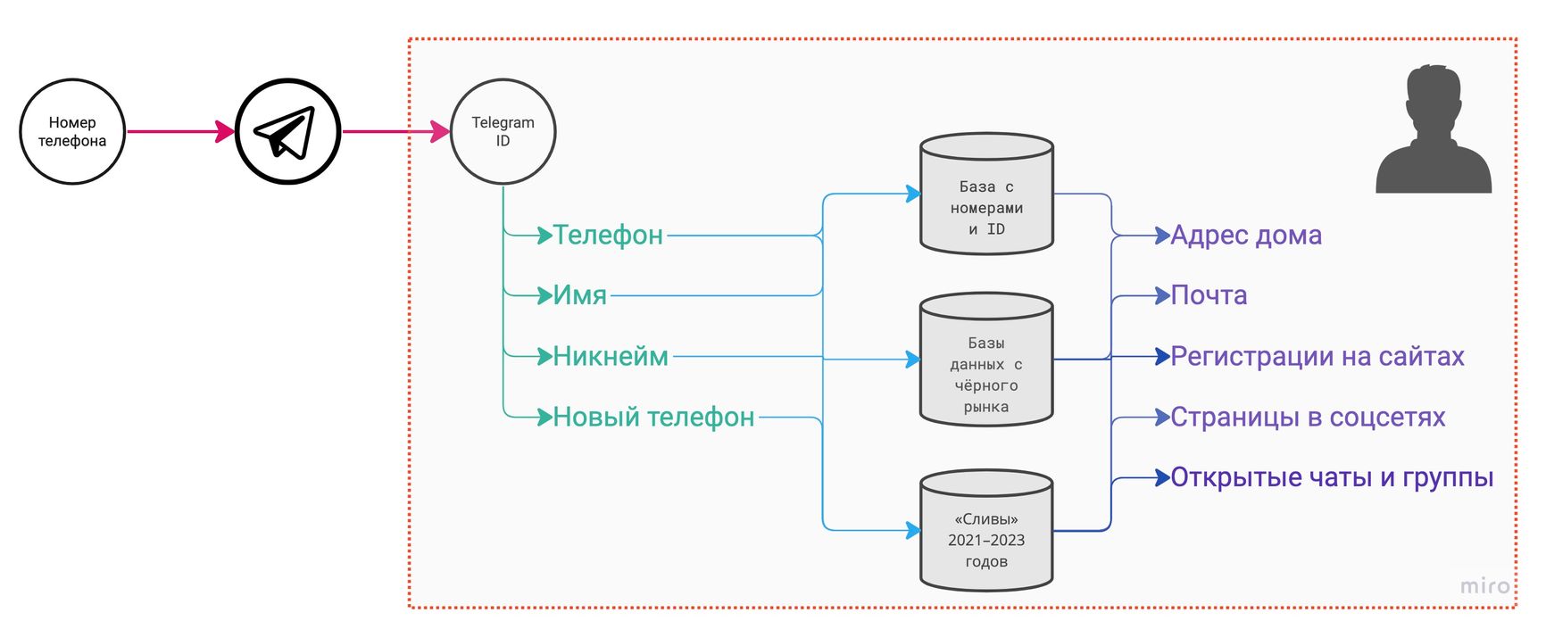 Работать это может примерно так. Человек покупает номер, который уже попал в подобную базу. Узнать, есть ли он там — невозможно: базы непубличны. Однако так как номера в них попадали методом простого перебора, вероятность этого велика. Ведь номер — это по сути 8-10-значное число (в зависимости от страны), а их набор конечен. Создатели базы заранее создают аккаунты, в которые добавляют все номера, и в момент регистрации человека в Telegram им приходит сообщение «ХХХ теперь в Telegram». После чего в базу добавляется связка «номер — новый присвоенный Telegram ID» , а также имя и никнейм. Если через какое-то время пользователь начинает заниматься чем-то, что не нравится государству, — например, продавать наркотики или участвовать в протестных движениях и делать это в открытых чатах, то силовик, который скорее всего тоже присутствует в этом же чате, перешлет сообщение в бот с базой пробива и узнает номер телефона благодаря связке «Telegram ID — номер телефона». Не спасет ни никнейм в духе «Anon Anonovich», ни скрытый номер телефона. Помимо этого, он получит информацию обо всех открытых чатах, где состоит пользователь, под каким именем записан у тех, кто знает его номер, и много другой информации, которая может ему пригодиться для рапорта. К тому же по номеру телефона он сможет получить ваши паспортные данные у оператора сотовой связи.