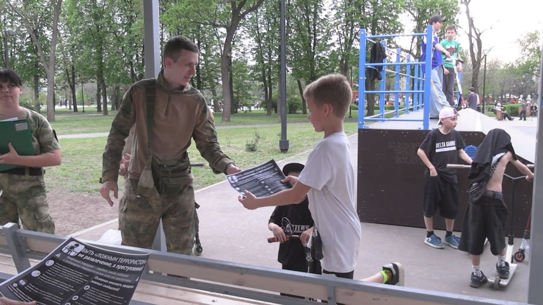 Еще одно направление пропаганды — борьба с «терроризмом» и «неонацизмом». В Донецке лекции «Терроризм как всемирная проблема» вели на спортивных секциях по очереди тренеры по боксу, стрельбе из лука и другим дисциплинам. В поддержку офлайн-мероприятий в соцсетях учебных учреждений запущена онлайн-кампания, грозящая детям уголовной ответственностью за интерес к разным точкам зрения: например, в паблике донецкой спортивной школы «Лидер» выложили видеоролик «Выкинь из головы идеи неонацистов!», герой которого лайкает протестные посты, а потом к нему приходят силовики.