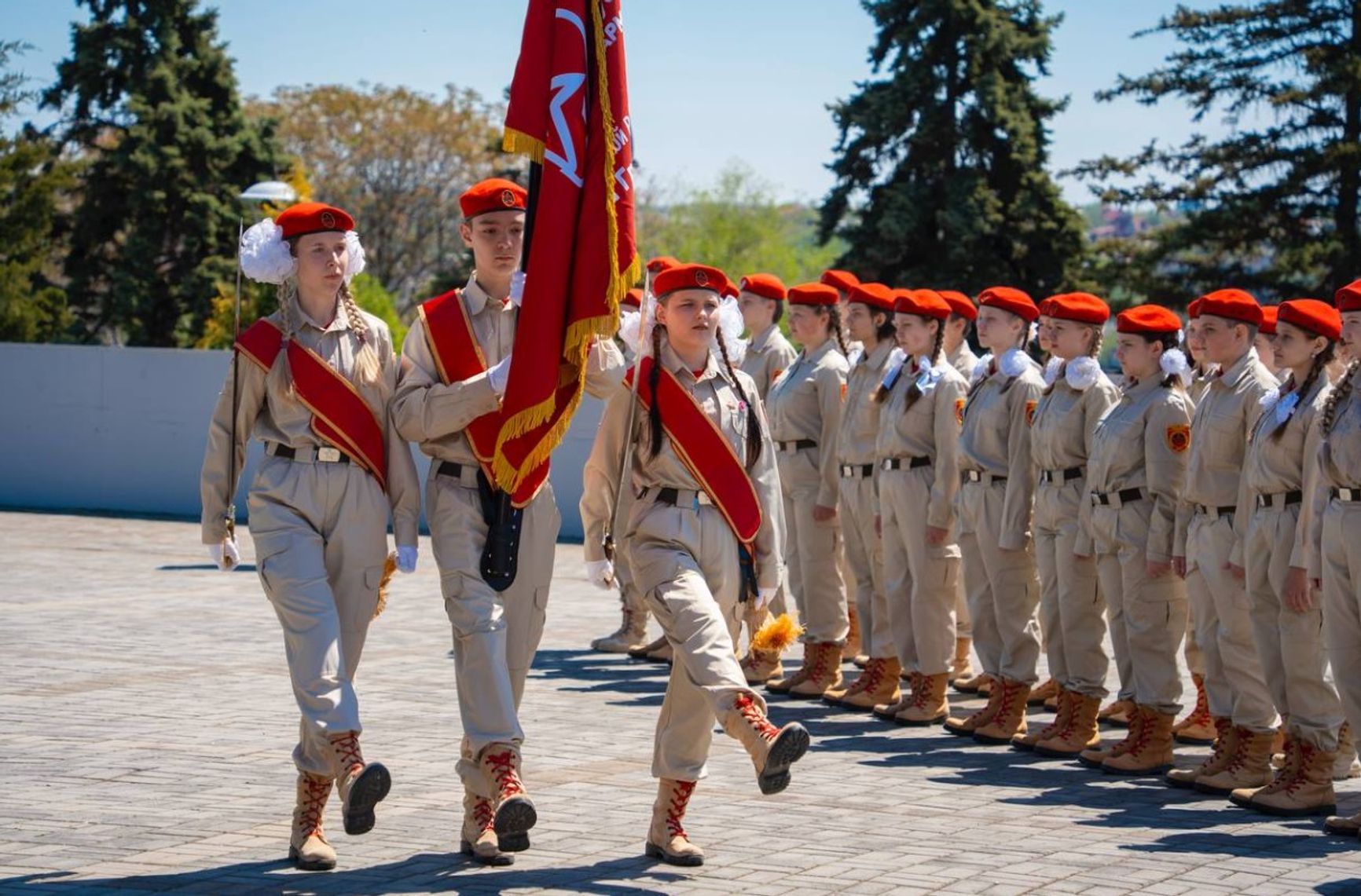 Военно-патриотический досуг предлагает и «возрождающее пионерские традиции» «Движение первых», что, согласно отчету ЕС, в действительности является обучением и перевоспитанием детей в милитаристском формате. Организация не пропускает ни одного государственного праздника. Например, в 2025 году в Донецке на фестивале в честь Дня защиты детей юные украинцы примеряли военную экипировку и знакомились с макетами оружия от Росгвардии, пока в другом районе города «Единая Россия» устроила парад военизированных детских колясок.