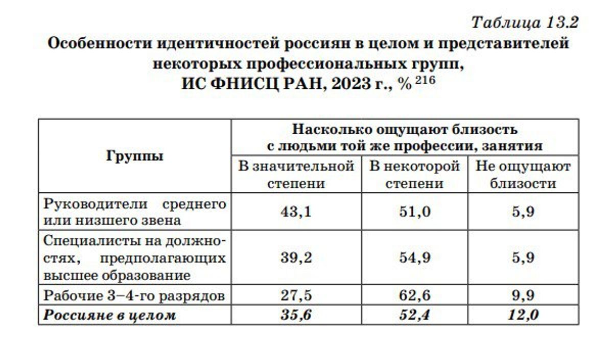 В отсутствие национальной общности люди доверяют только своему непосредственному окружению. По опросам известно, что за пределами семьи, близких и друзей россияне больше всего доверяют коллегам, ассоциируя себя со своей профессиональной группой: врачи с врачами, чиновники с чиновниками, военные с военными и так далее.