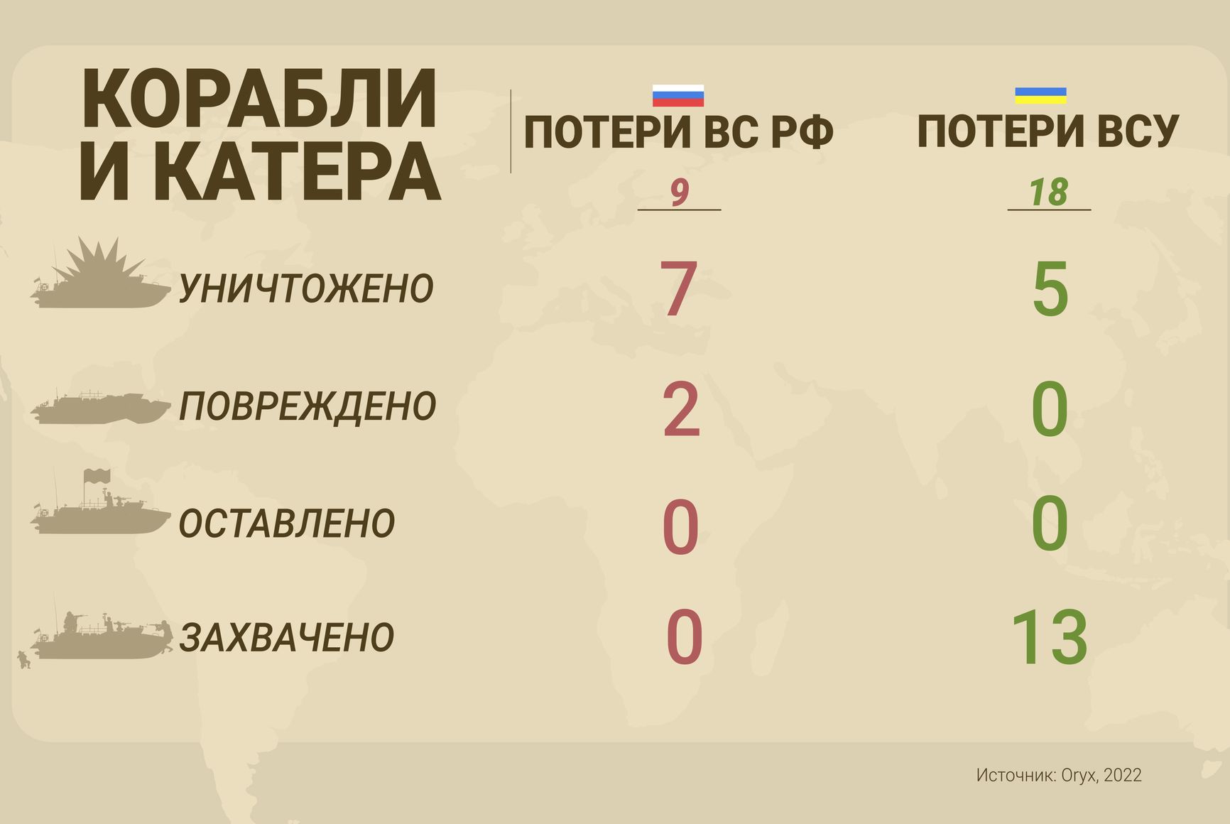 Но совершенно неожиданно гораздо больший ущерб понес Черноморский флот. Украинцам удалось потопить флагман и самый мощный корабль ЧФ РФ — ракетный гвардейский крейсер «Москва». Детали операции остаются не до конца ясными (вполне вероятно, что удар был нанесен не украинскими противокорабельными ракетами «Нептун», как принято считать, а иными средствами), но требовавшийся для нее уровень тактической выучки и координации оценивается экспертами как исключительно высокий.