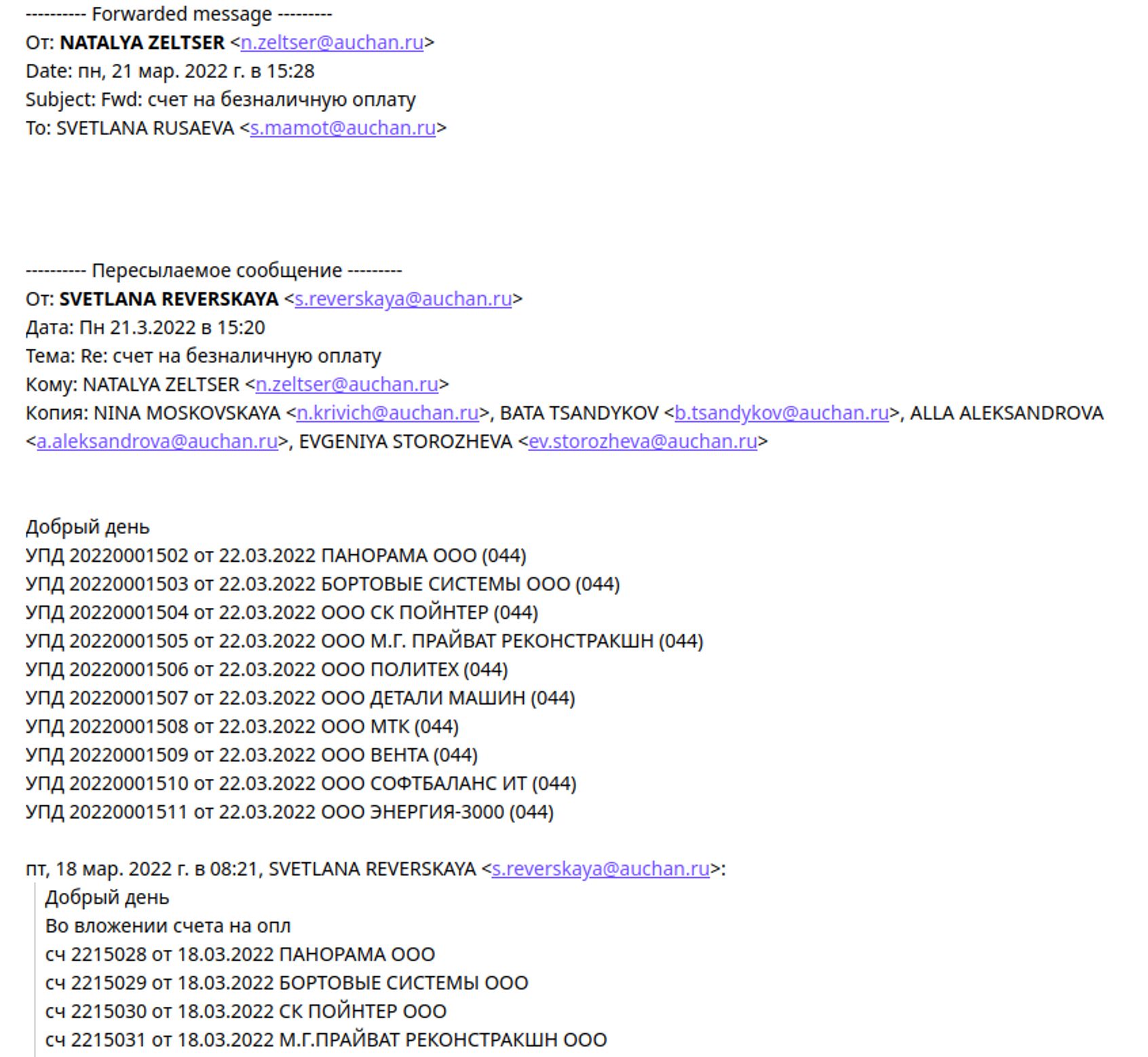 17 марта 2022 года в 14:50 контролер управления Наталья Зельцер просит в корпоративной бухгалтерии центрального офиса «Ашан» в Москве выставить счета на десять юридических лиц. 18 марта бухгалтер ЦО «Ашан» подтверждает выставленные счета. Все десять выбранных компаний выполняют заказы для госкомпаний или муниципальных учреждений.