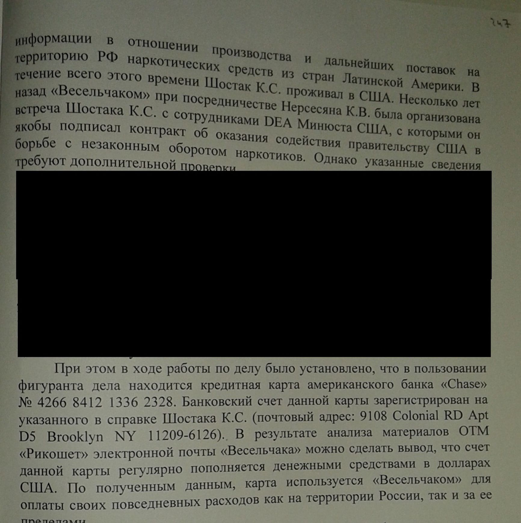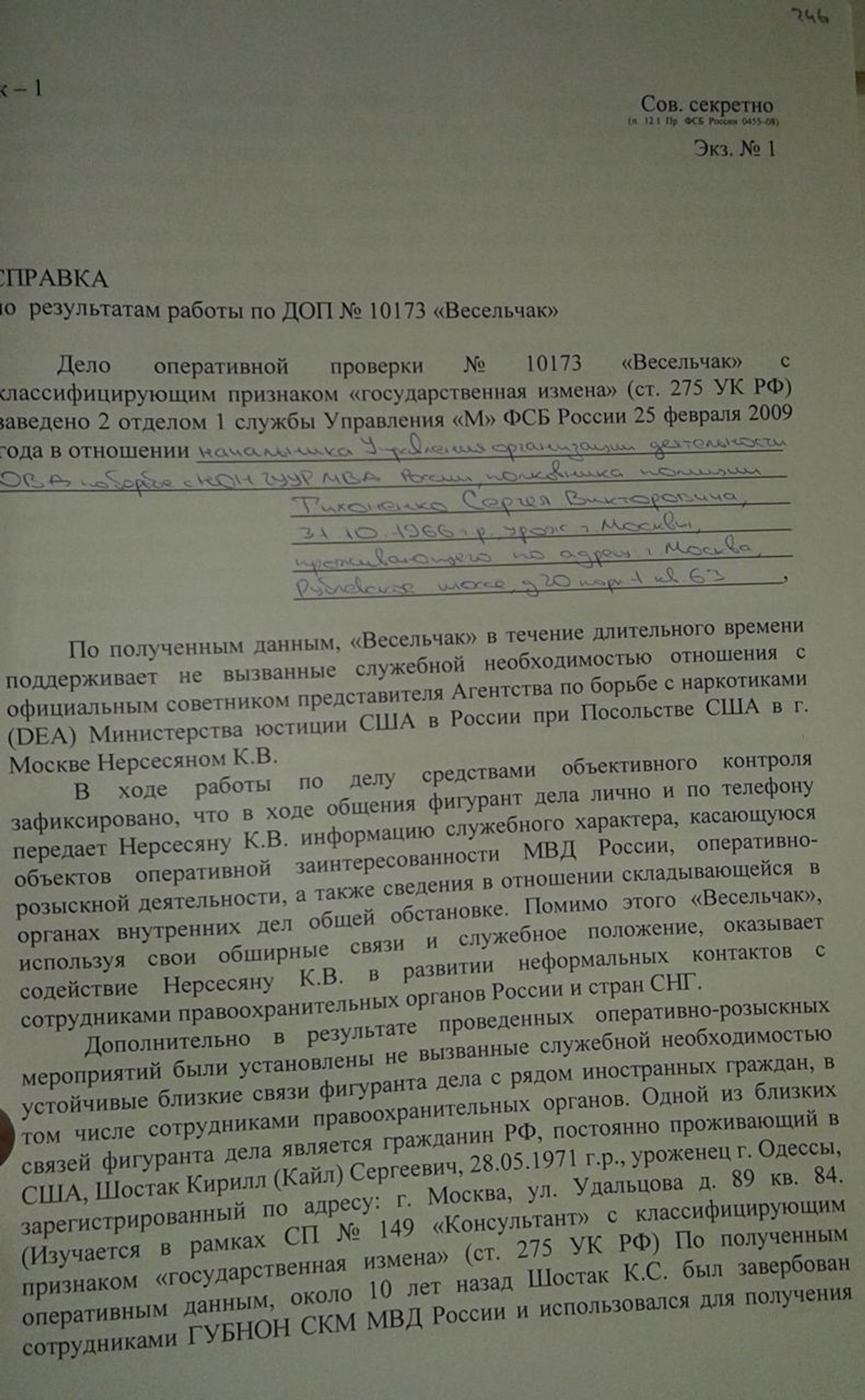 «По полученным оперативным данным около 10 лет назад Шостак К.С. был завербован сотрудниками ГУБНОН СКМ МВД России и использовался для получения информации в отношении производства и дальнейших поставок на территорию РФ наркотических средств из стран Латинской Америки. В течение всего этого времени Шостак К.С. проживал в США. Несколько лет назад “Весельчаком“, при посредничестве Нерсесяна, была организована встреча Шостака К.С. с сотрудниками DEA Минюста США, с которыми он якобы подписал контракт об оказании содействия правительству США в борьбе с незаконным оборотом наркотиков. Однако указанные сведения требуют дополнительной проверки».