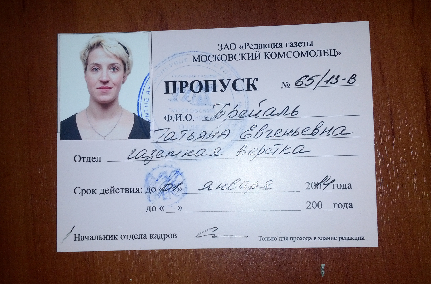 Идет обсуждение событий, когда бросили дымовую шашку в ред. В день «пожара» в редакции - по моему пропуску, вернее, - по его дубликату кто-то заходил в здание, судя по отметкам в журнале. Меня ТОЧНО там не было! Время входа и выхода близко к моменту события. Цветной копии моего пропуска в ДРУГИХ организациях нет. Это создает ряд неприятных моментов,  неудобств и безосновательных подозрений.